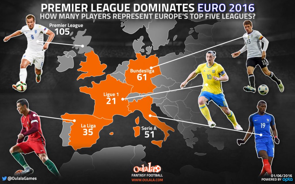 The Infographic provided by Oulala shows that Liverpool are the most represented club at Euro 2016 & the Premier League is the most represented European league.