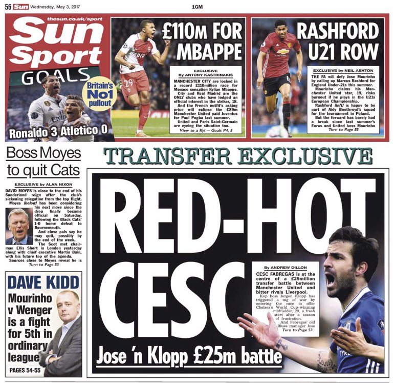 Cesc’s high wages should not be a problem for a club like Manchester United but Liverpool may think twice because he is already earning more than their highest earner, Coutinho (Star).