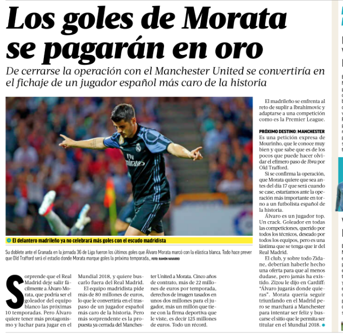 Marca claim (image from Sport Witness) that Man Utd have agreed a five year deal worth €125 million with the 24-year-old Spanish striker. This meansthat on average, he will be getting around €25million-a-year, €480,000-a-week (£420,000-a-week).