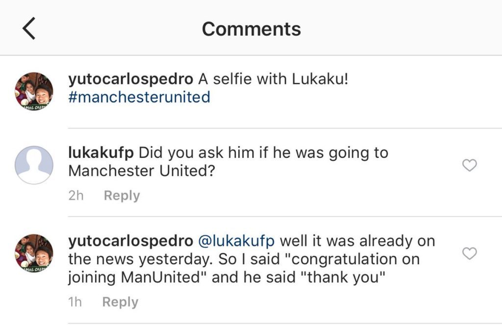In the comments sections, Yuto claimed that he congratulated the 24-year-old striker on joining the Red Devils and Lukaku thanked him for that (picture provided below).