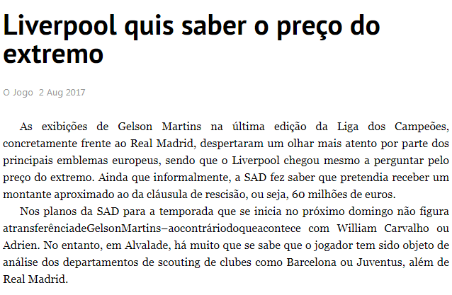 It is stated that the Reds wanted to know about the price of the player and Sporting informally told them that they want 60 million euros (£54million) i.e. the release clause in his current contract.